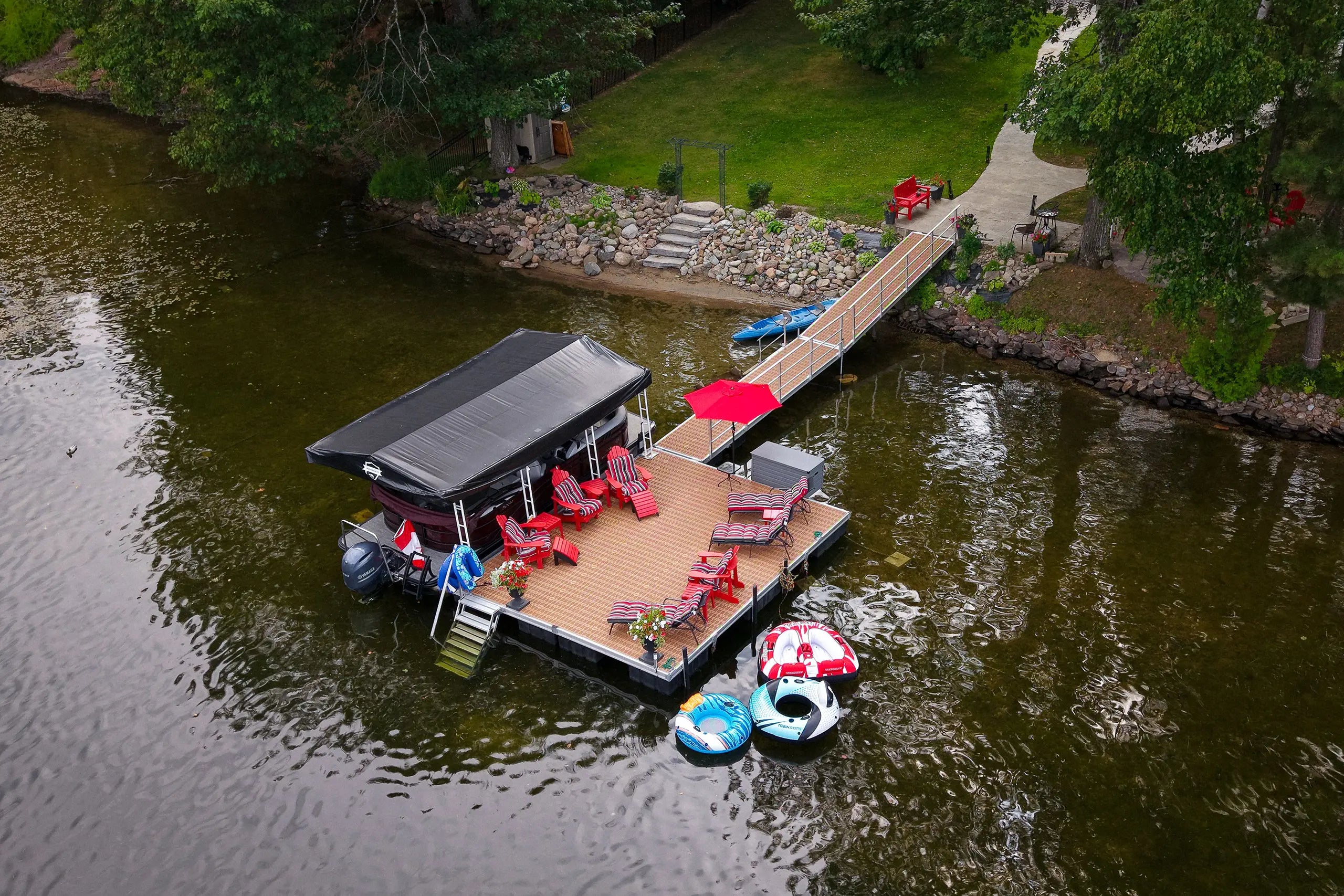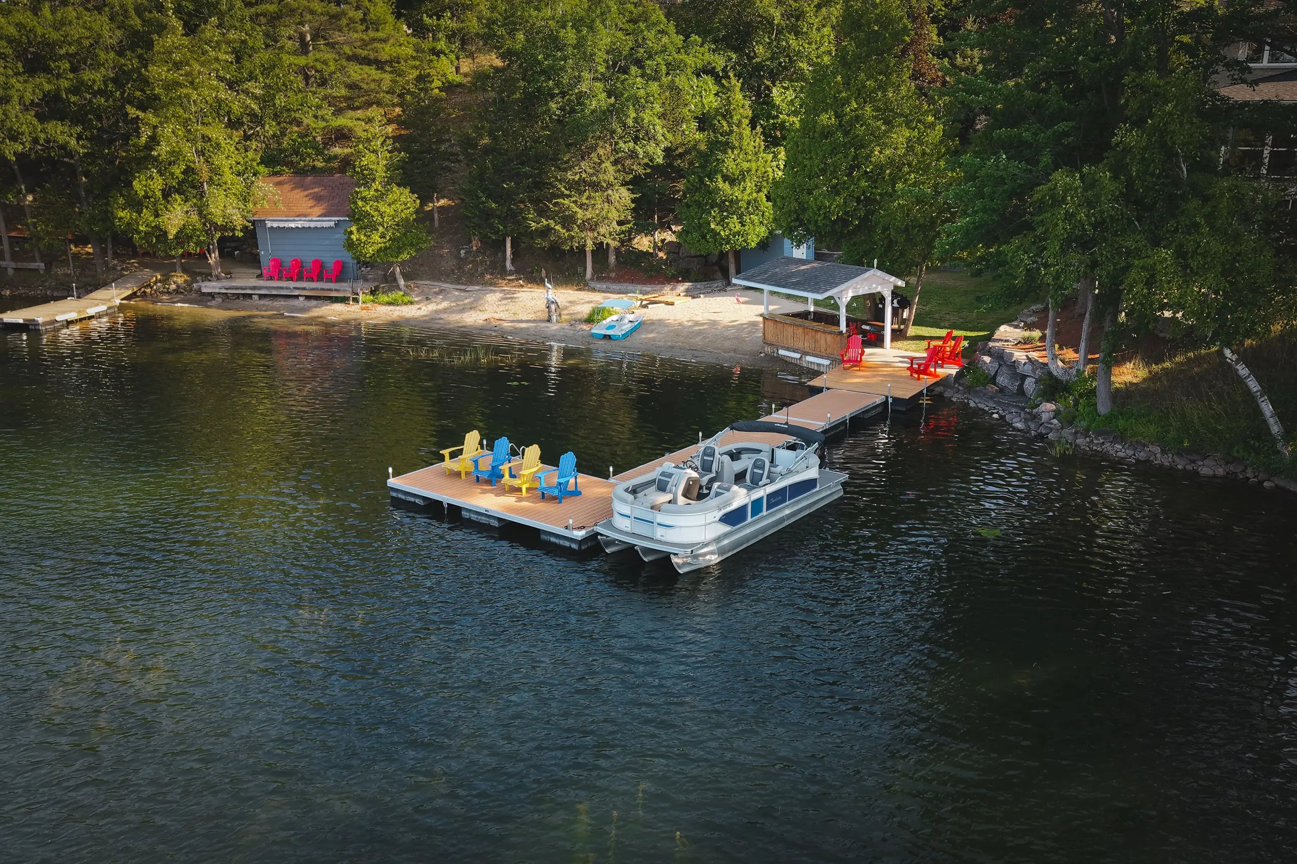What’s the difference between a pole dock and a floating dock? A pole dock is designed for shallow water and is supported by posts anchored to the lakebed. It must be fully removed in the fall and reinstalled in the spring.